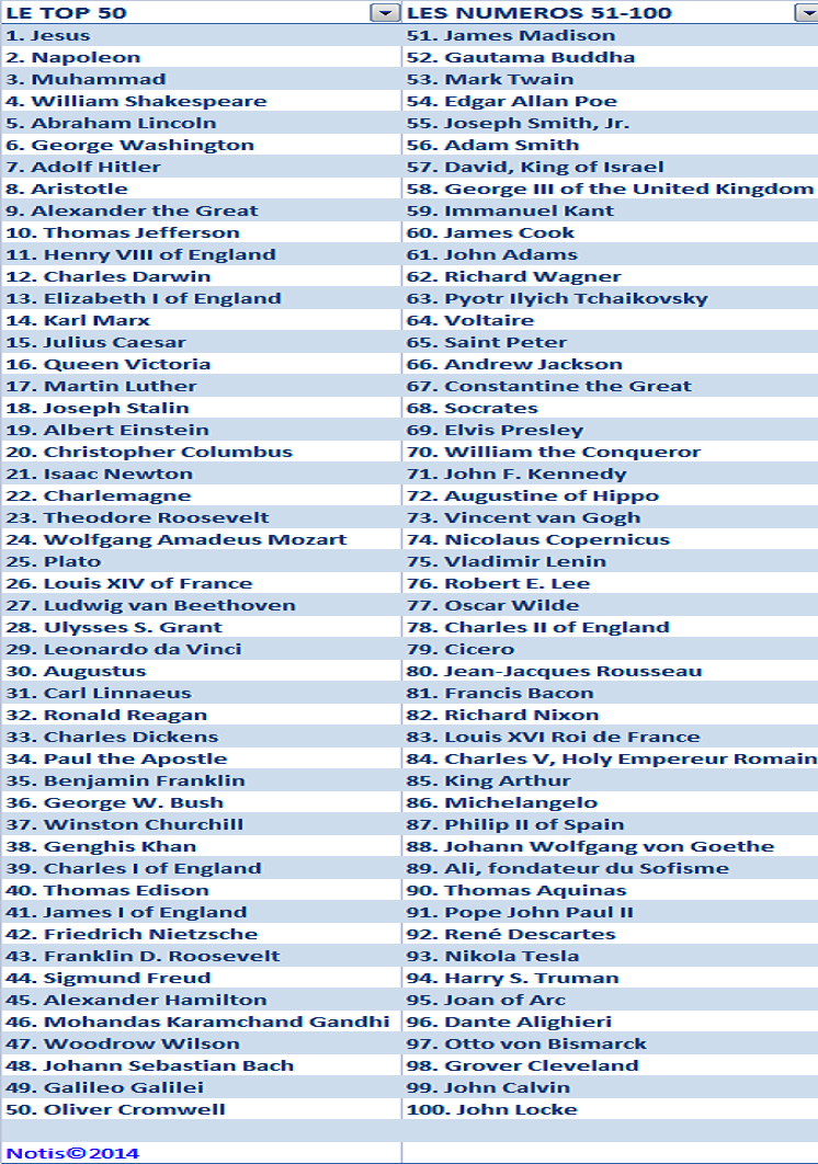 Le Christ est la figure la plus marquante de l’histoire, selon une analyse de trois millions de pages numériques. Le classement est le fruit d’un «algorithme» prenant en compte la longueur des textes consacrés à une personnalité de l’histoire, le nombre de lecteurs et de liens à partir ou vers d’autres pages consacrés à d’autres grandes figures de l’histoire. Ont également été pris en compte, plusieurs sondages d’opinion publique, des statistiques sportives, les réalisations et prix artistiques (œuvres biographiques, peinture…). Le classement complet est dans un livre intitulé, « Qui est le plus grand : Les figures les plus marquantes de l’histoire »