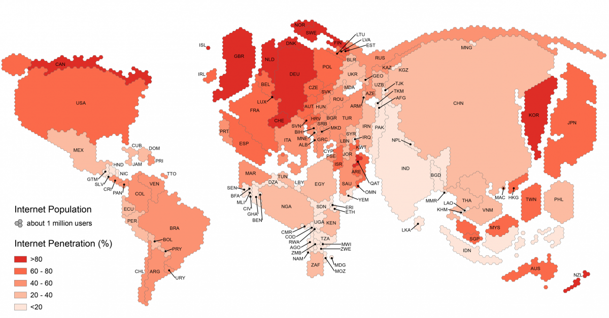 L’ombrage de chaque pays reflète son taux de pénétration de l’Internet dans la vie De ses citoyens. Tandis que des nuances plus foncées indiquent des niveaux plus élevés d’utilisation d’internet dans une population donnée. Il en découle que certains pays peuvent paraître plus grand, car ils ont une plus grande proportion de personnes utilisant le web, mais par rapport à la population dans son ensemble, la pénétration peut être faible.