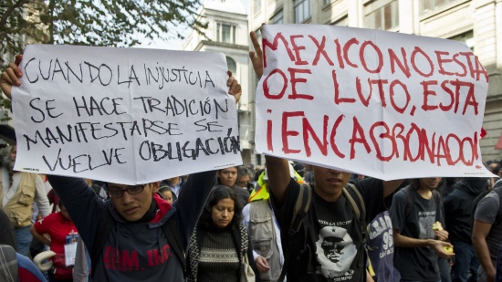Fin septembre … quarante-trois élèves de sexe masculin de la Kuala, ville du Mexique, ont disparu sur la route. Là-bas on pense qu’ils ont été enlevés par la police et livrés à un cartel de la drogue locale. On les a retrouvés assassinés et carbonisés … la convergence de ces assassinas et la corruption du gouvernement a débouché sur des protestations nationales contre la gestion de cet autre événement malheureux. Les protestations contre le gouvernement corrompu étaient à la fois pacifiques et violentes …