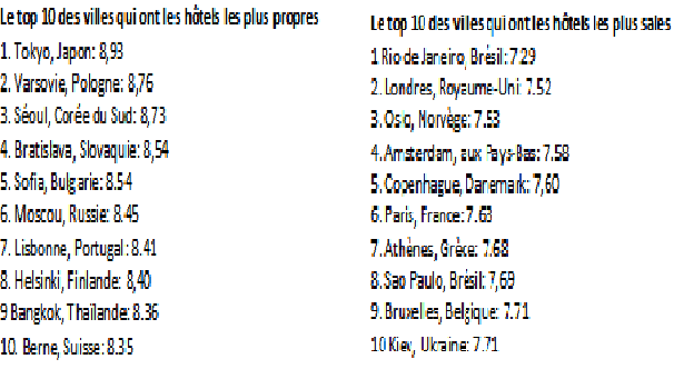 Le site de réservation d’hôtel « Hotel.info » a établi une liste mondiale des hôtels qui ne respectent pas les règles élémentaires d’hygiène. Six millions de clients ont été interrogés et les villes abritant des hôtels ont été notées de 01 à 10, pour leur propreté. Il appert de cette enquête internationale que les hôtels de Tokyo sont très bien entretenus en comparaison avec d’autres grandes villes du monde. Les clients des hôtels de Varsovie pourraient eux-aussi manger leur nourriture à même le sol. La Coupe du Monde a été une excellente occasion pour les hôtels du Brésil ternir leur image, à l’instar de l’équipe national de football brésilienne.