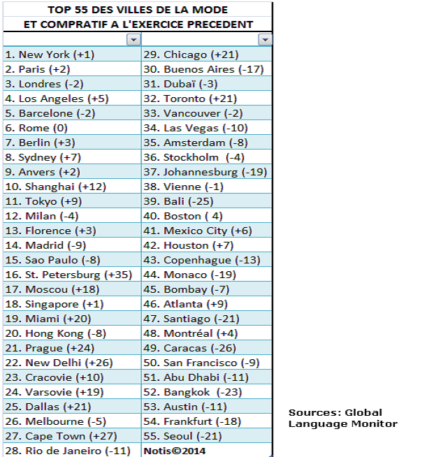 Selon une étude réalisée par «Global Language Monitor» (GLM), une société de statistique ayant pour objet la recherche, la collecte et le traitement de données sur les mots, phrases, concepts et tendances, la ville de New York serait la capitale mondiale de la mode. Paris occupe la deuxième place, suivie de Londres et Los Angeles. Le continent Asiatique est également bien représenté avec Shanghai à la dixième place, suivie de Tokyo (11ème), Singapour (19ème) et Hong Kong (20ème). L’Afrique est représentée par deux villes, Cap Town (27ème) et Johannesburg (37ème).